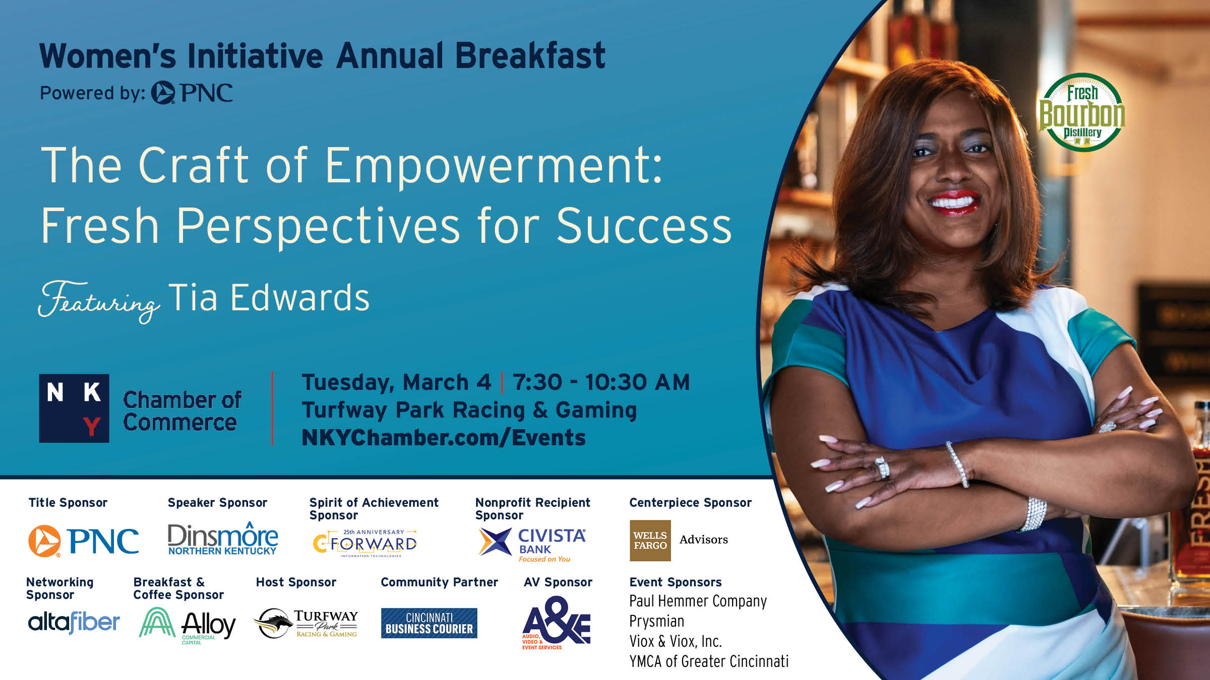 Annual Breakfast 2025 “The Craft of Empowerment: Fresh Perspectives for Success,” will feature keynote speaker Tia Edwards sharing how her business, Fresh Bourbon Distillery, has enabled her to craft success in business her way. March is Women’s History Month, which provides the perfect backdrop for Edwards’ story about the importance of empowering oneself to follow one’s dreams and how to overcome distractions along the way.