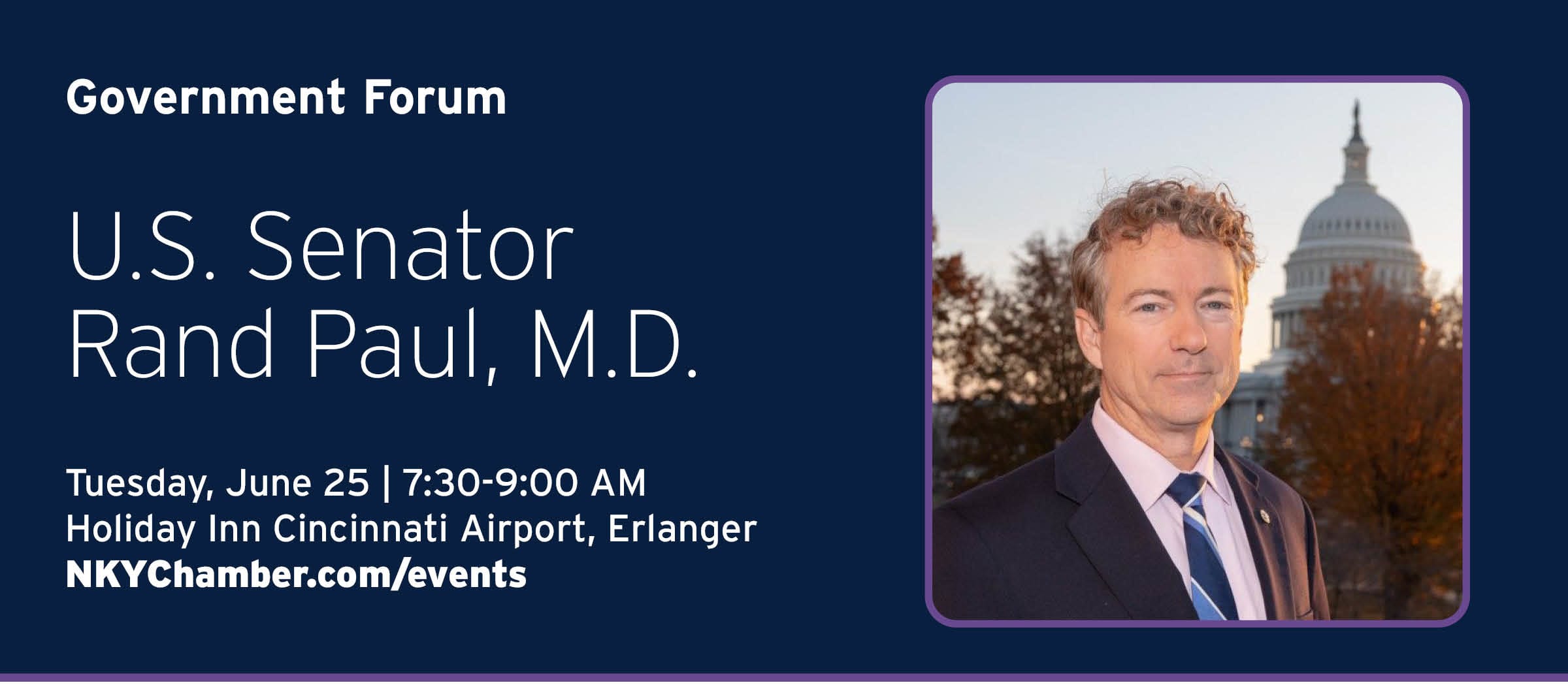 Join us for our next government forum featuring U.S. Senator Rand Paul, M.D. This event is a unique opportunity for NKY Chamber members to engage with Senator Paul and learn about his recent legislative achievements that significantly benefit the Commonwealth of Kentucky and NKY. Hear more about Senator Paul’s critical amendment to streamline the layover of goods at the Cincinnati-Northern Kentucky International Airport (CVG), which President Biden recently signed into law. Don’t miss this opportunity to hear firsthand from Senator Rand Paul about how this legislation and other work he is doing will impact our region and the Commonwealth. Don’t miss this morning of insightful discussion and networking.