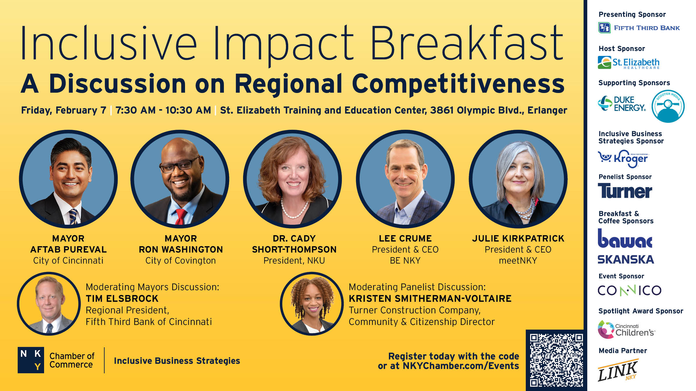 Mayor Aftab Pureval, City of Cincinnati, and Mayor Ron Washington, City of Covington, will open the event with a dynamic discussion on community competitiveness, exploring what sets Northern Kentucky and Cincinnati apart from other cities and communities and how collaborative efforts among all community stakeholders contribute to promoting a strong, vibrant and welcoming destination for attracting businesses and talent. Don’t miss this opportunity to make an impact and drive progress and innovation.