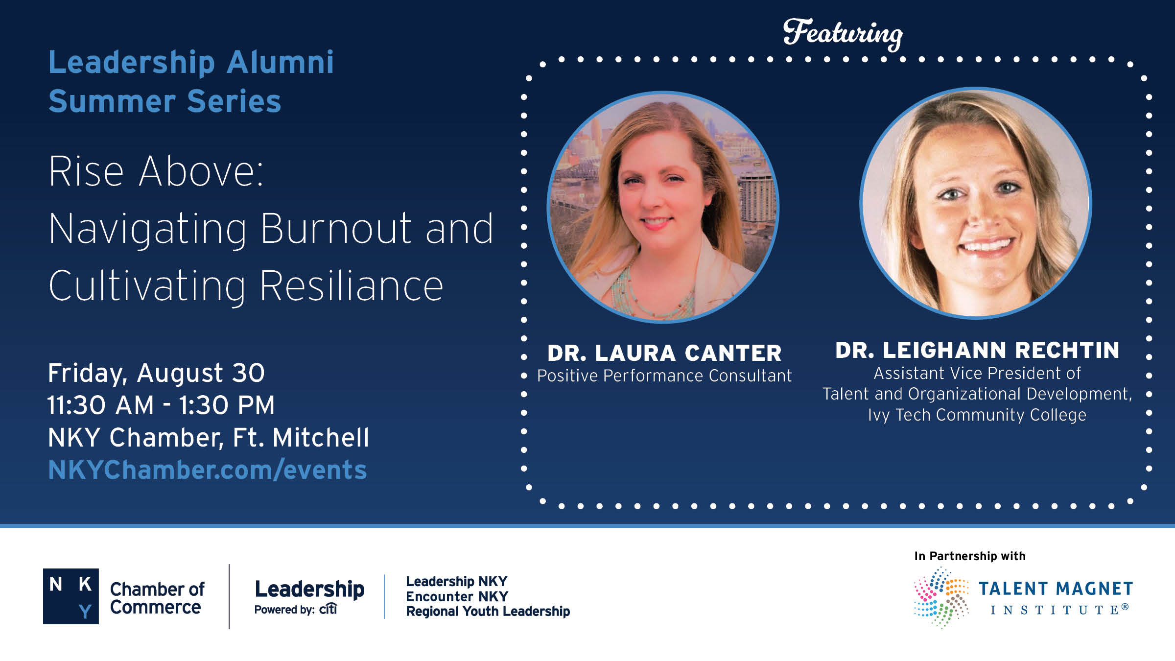 Join us for lunch and attend the Leadership Alumni Summer Learning Series on August 30 presented in partnership with the Talent Magnet Institute. The topic of our August session is Rise Above: Navigating Burnout and Cultivating Resilience featuring Dr. Laura Canter and Dr. Leighann Rechtin with the Talent Magnet Institute.