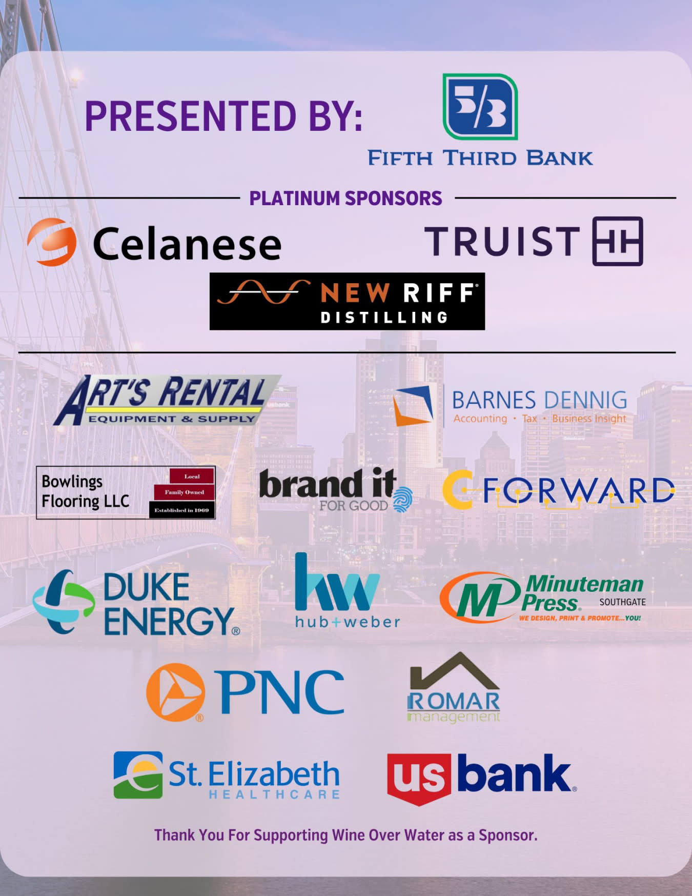 Wine Over Water is a spectacular event featuring local beverage tastings, scrumptious food samples, live entertainment, and breathtaking views from the Purple People Bridge. This event raises funds for Brighton Center, a community-based organization in Newport, KY that creates opportunities for individuals and families to reach self-sufficiency. Last year alone, Brighton Center impacted the lives of over 31,000 local individuals.