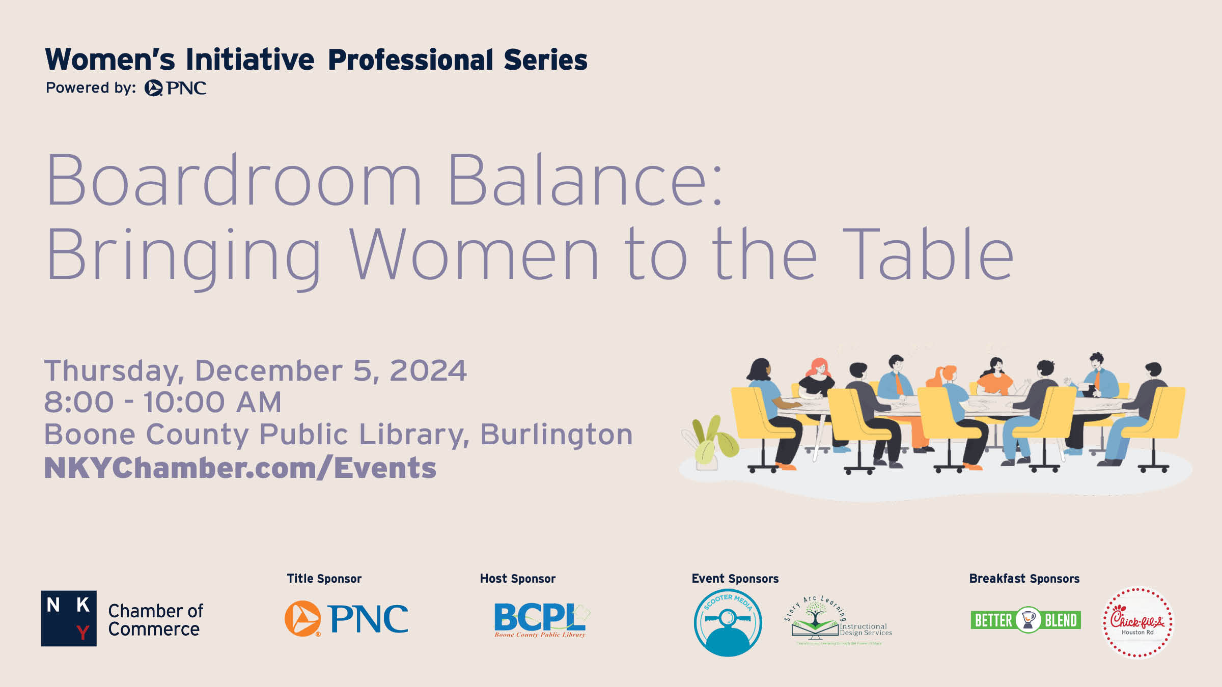 The next installment of the NKY Chamber Women's Initiative Professional Series is coming up December 5th! "Boardroom Balance - Bringing Women to the Table" will feature women leaders discussing the importance of active board involvement, highlighting how it can strengthen careers, add value to companies and enhance the influence of representation within the community.